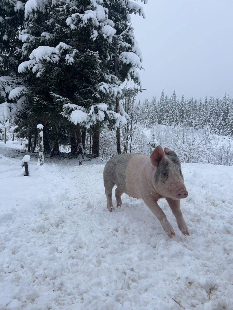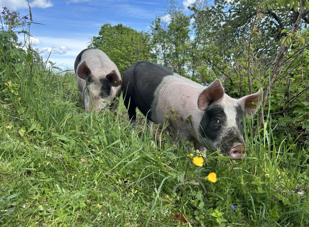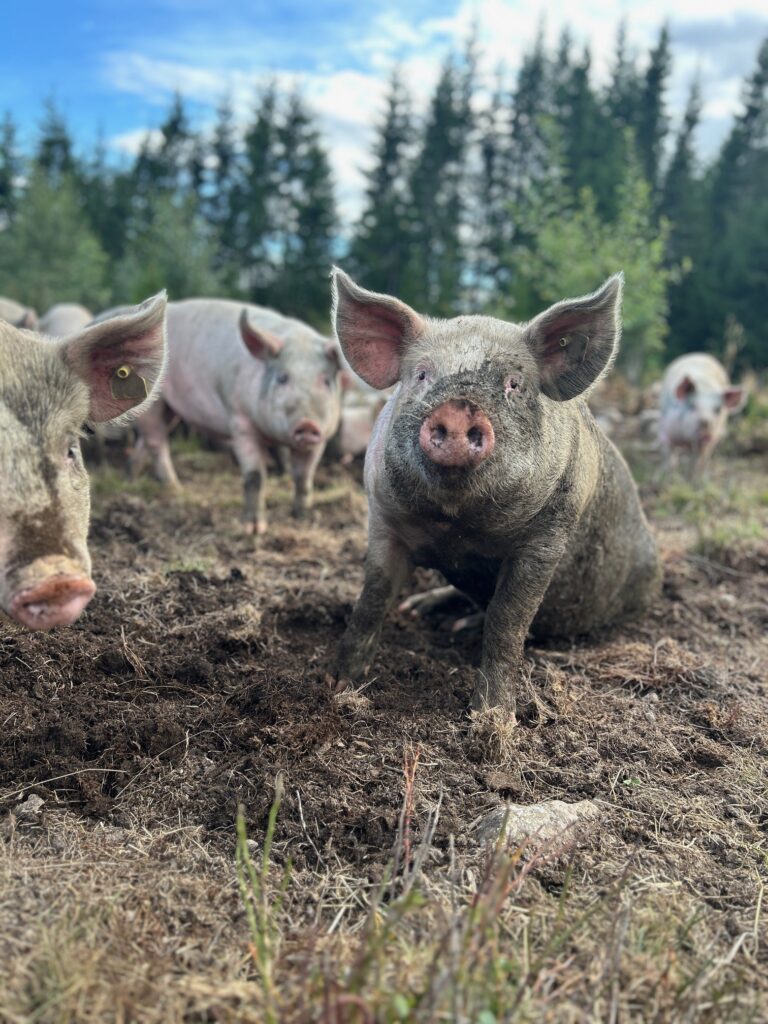 Her kan vi uforbeholdent svare JA! Kjøttet er saftig og med fin marmorering, og har en mild smak av gris, i motsetning til den stramme smaken man enkelte ganger kan oppleve. Vi er helt overbevist om at de ekstra fôrtypene vi forer med (bakevarer og mesk) er med på å sette prikken over i’en.